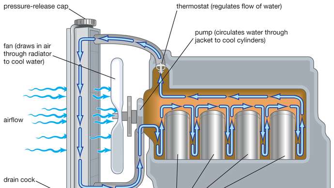 Охлаждающая жидкость вытекает из водяного насоса по каналам, расположенным внутри блока цилиндров. На своем пути он собирает тепло, выделяемое цилиндрами. После этого он поднимается к головке блока цилиндров (или головкам в двигателе V-образного типа), где собирает остаточное тепло из камер сгорания. Затем охлаждающая жидкость направляется к термостату на случай, если термостат откроется, чтобы жидкость могла пройти. Оттуда охлаждающая жидкость проходит по тонким уплощенным трубкам, составляющим сердцевину радиатора.