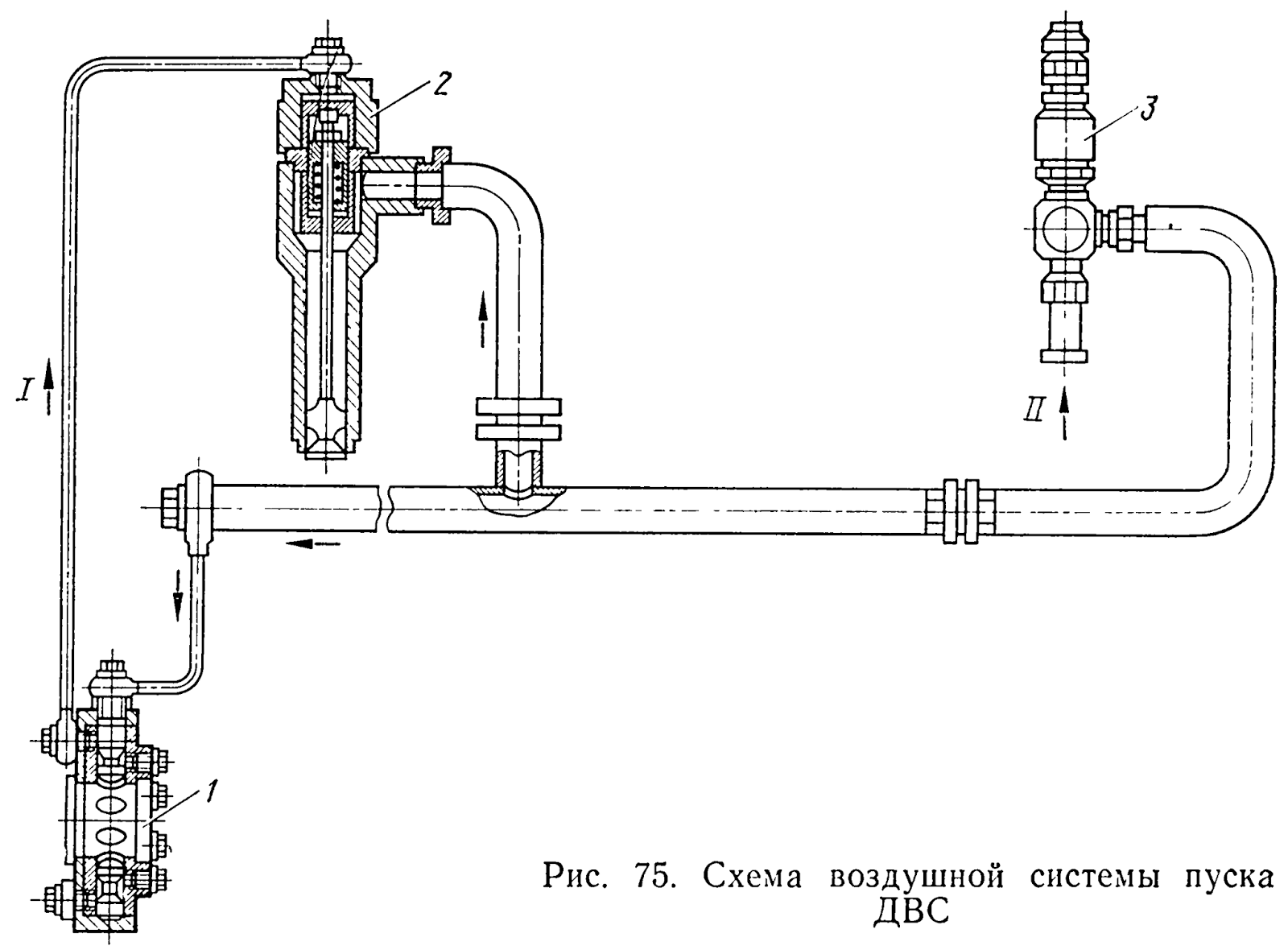 В чугунном корпусе 2, закрытом крышкой 6, расположен стальной клапан 3, нагруженный пружиной 5. В крышке 6 располагается поршень 7, который под давлением воздуха может перемешаться вниз, действуя на шток клапана 3. Между корпусом клапана и крышкой цилиндра для уплотнения устанавливается красномедная прокладка 1 и два резиновых кольца 4. Полость а пускового клапана соединена с пусковой магистралью двигателя, но клапан 3 не открывается, так как действие пружины на клапан сильнее действия воздуха. Как только воздух от пускового воздухораспределителя поступит в полость b, под его давлением поршень 7 опустится вниз и откроет пусковой клапан. В результате этого воздух из полости а поступит в цилиндр и двигатель начнет вращаться. После поворота кривошипа данного цилиндра на определенный угол пусковой воздухораспределитель сообщит полость в с картером двигателя, давление в ней упадет и под действием пружины 5 пусковой клапан сядет на свое седло. В результате подача воздуха в этот цилиндр двигателя прекратится.sudoremont.blogspot.com