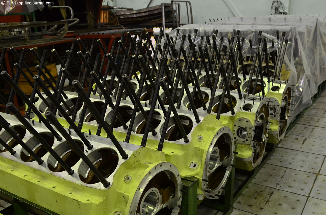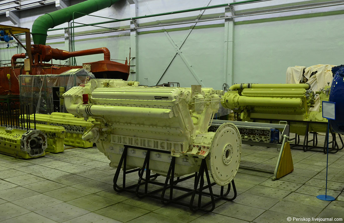11. Синий двигатель - М-503Б, для морских тральщиков проекта 266. Черного цвета двигатель, немного попавший в кадр справа - это М-580, устанавливается в качестве вспомогательного на большие атомные подлодки пр. 941, 949, 971Б. Но черный - это только эталонный образец, при передаче заказчику его всё равно красят в гост-овский цвет.