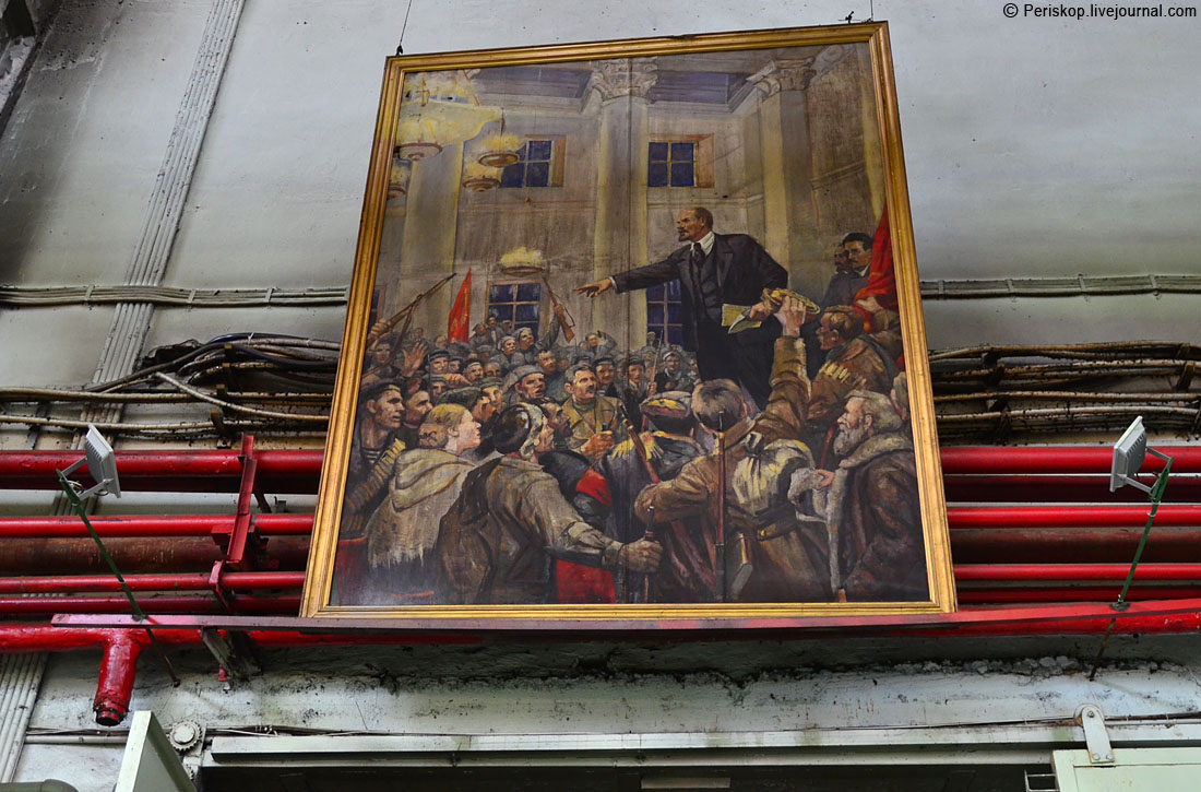 15. Идём на испытательную станцию. На воротах цеха - артефакт советской истории. "Не мешает вам Ильич?" - "А чего он будет мешать? Нет, конечно. Пусть будет, это же часть истории предприятия".