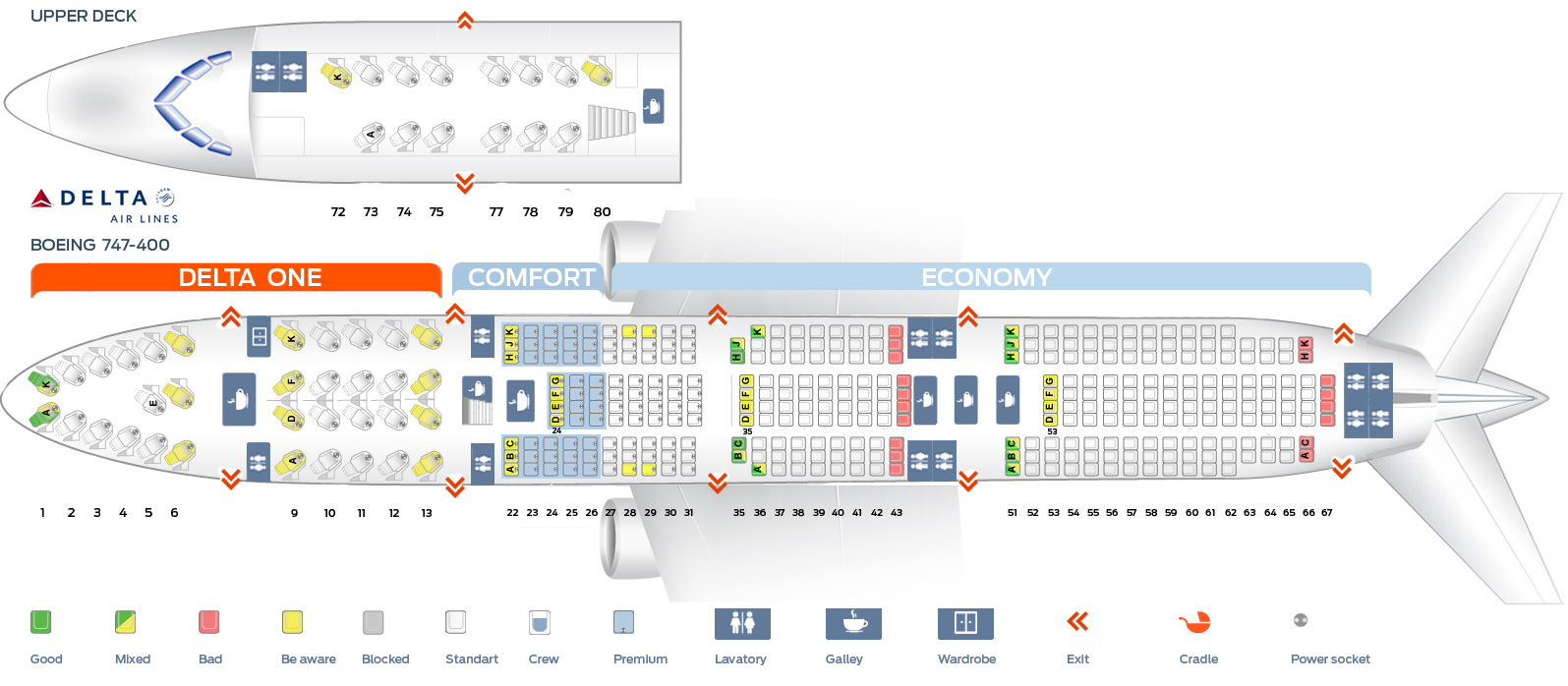 Самыми удобными считаются места возле аварийных выходов. Там предоставляется много места для ног. Однако там же расположены и санитарные комнаты, которые могут доставить некоторый дискомфорт. Такие места расположены где-то между 23–24 рядом и 37–38 в зависимости от авиакомпании. Также туалеты и кухня расположены в хвостовой части авиасудна.