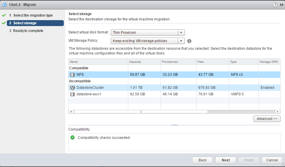 Выше мы упомянули решение для ручного сжатия дисков с тонким выделением ресурсов. Однако есть еще один способ управления вашими виртуальными дисками (как с тонким, так и с толстым предоставлением), если вы используете кластер хранилища данных в vSphere. VMware обеспечивает автоматическую миграцию виртуальных дисков в кластере хранилища данных, чтобы избежать переполнения дискового хранилища, где расположены виртуальные диски с тонким предоставлением, и сбалансировать ресурсы ввода-вывода. Если к серверу ESXi подключено несколько общих хранилищ данных, вы можете настроить планировщик распределенных ресурсов хранилища (Storage DRS). Storage DRS — это интеллектуальная функция vCenter Server для эффективного управления хранилищем VMFS и NFS, которая обеспечивает автоматическое размещение и миграцию дисков виртуальной машины. Вы также можете установить Storage DRS в ручной режим, если предпочитаете утверждать рекомендации по миграции вручную.
