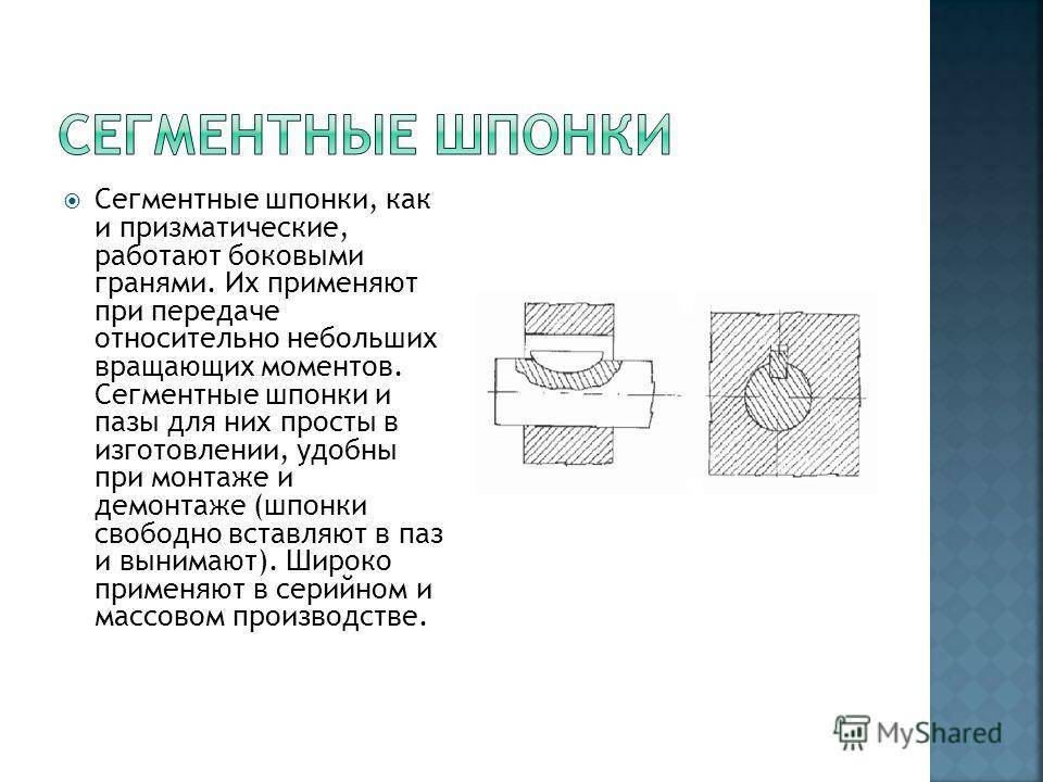 Чаще всего используются обычные призматические шпонки. Они воспринимают нагрузки своими боковыми гранями, в отличие от клиновых, передающих крутящий момент за счет сил трения, которые возникают на верхней и нижней гранях, упирающихся в вал и ступицу. Сегментные шпонки работают по тому же принципу, что и призматические, но для их установки необходимы пазы большей глубины, которые более существенно снижают прочность валов. Также необходимо отметить, что при монтаже призматических и сегментных шпонок в деталях не возникают внутренние напряжения, а клиновые и тангенциальные изделия запрессовываются (их монтаж вызывает появление постоянно действующих сил упругости, вызванных предварительной затяжкой).