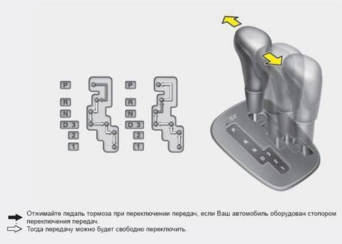 | Трогание | Автомат сдвинется с места, если водитель переключит режим «Паркинга» в «Драйв». Для этого нужно разблокировать селектор. Рычаг блокируется через систему тросовых приводов, пружин и храповой пластины. Для освобождения механизма нужно повернуть ключ в замке зажигания, нажать на тормоз, а затем передвинуть селектор. |