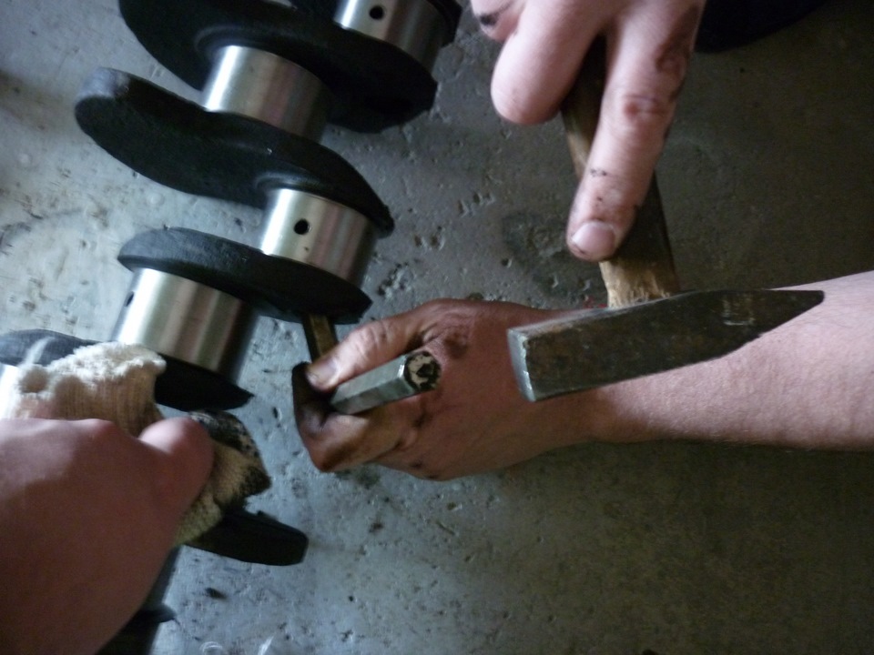После шлифовки шеек коленчатого вала болтом с головкой “на 14” и законтренными гайками выворачиваем заглушки.