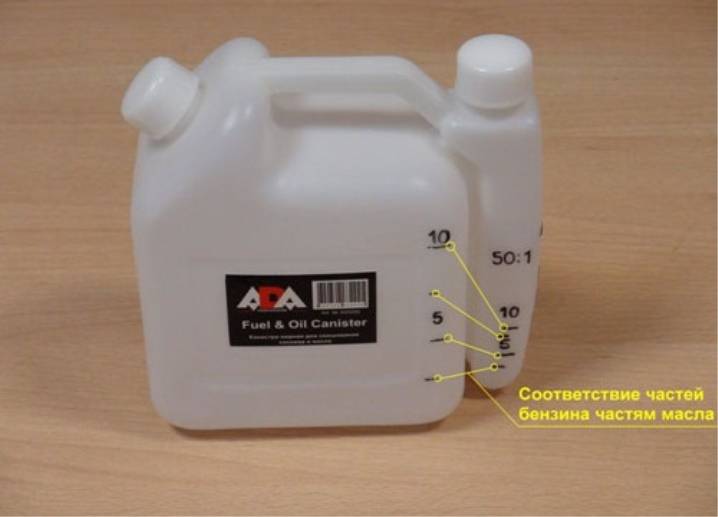 Прежде чем разбавить бензин с маслом для бензопилы, нужно подготовить специальную канистру. Пластиковые и стеклянные бутылки не подойдут, также нельзя заливать средство сразу в бак. Узнать, сколько масла на литр бензина в триммер нужно наливать, проще всего из инструкции, приложенной к оборудованию.