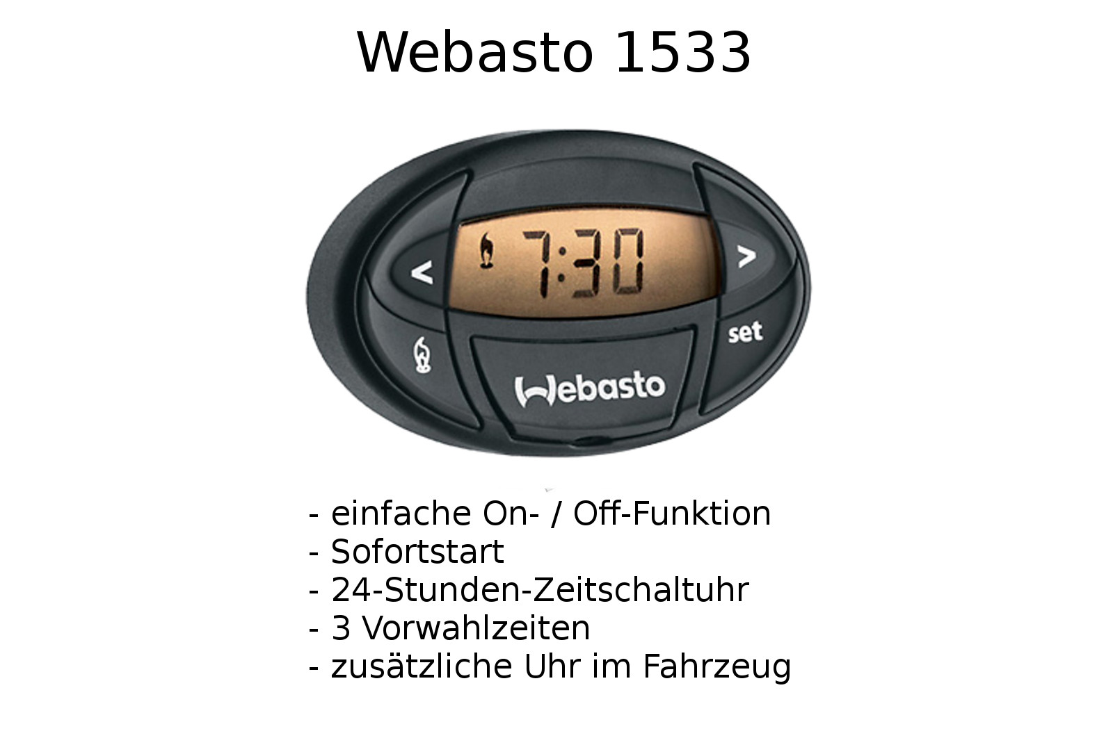 Отопителем можно управлять изнутри автомобиля посредством переключателя или таймера (Webasto MultiControl / Таймер 1533). Таймер дает возможность настроить включение подогрева в определенный день и время.