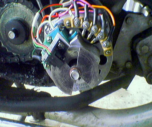 Опытным путем начали подбирать точку воспламенения. Я из всей настройки электроники знаю одно правило-надо найти точку, в которой мотор будет заводится в обе стороны-то есть резко дергаем лапку-правильный запуск, дергаем медленно-лапка немного отдает назад и мотоцикл заводится в обратную сторону) Вот этой точкой оказались 4,4 мм до ВМТ.