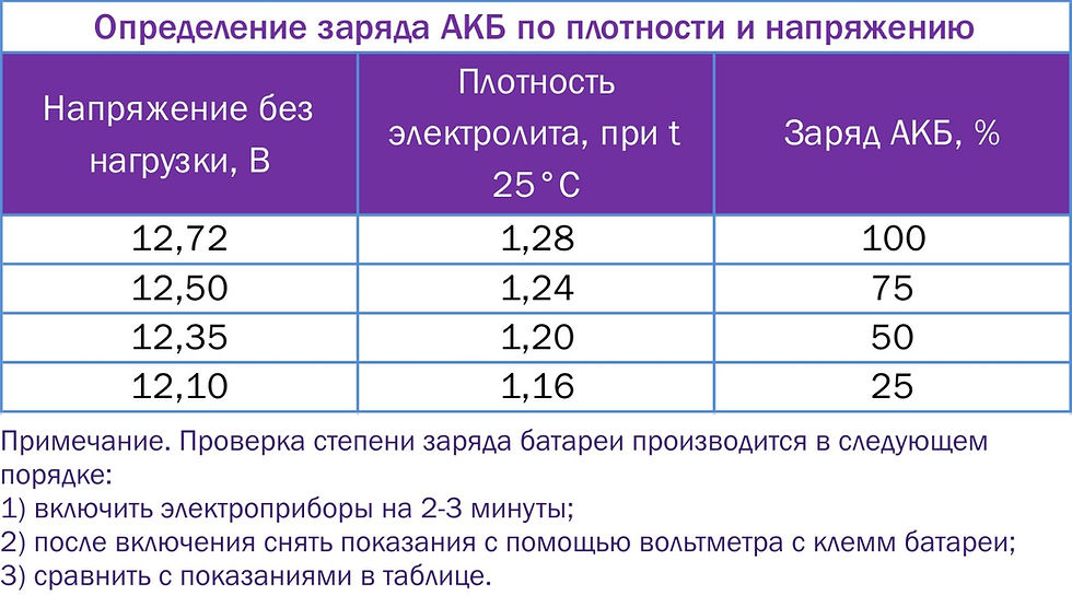 65 вольт, допускается, чтобы напряжение АКБ автомобиля было чуть менее большим или меньшим, на 0.5 В. Если значение заряда меньше, это говорит о недостаточной зарядке девайса. К примеру, если показатель заряда равен примерно 12.42 В, это свидетельствует о том, что АКБ заряжено примерно на 80%. Если напряжение автомобильного аккумулятора составляет 12.2 В, то уровень заряда составляет 60%. В том случае, если данный показатель составит только 11.9 В, это свидетельствует о критически низком уровне заряда батареи, использование такой АКБ может привести к невозможности запуска мотора.