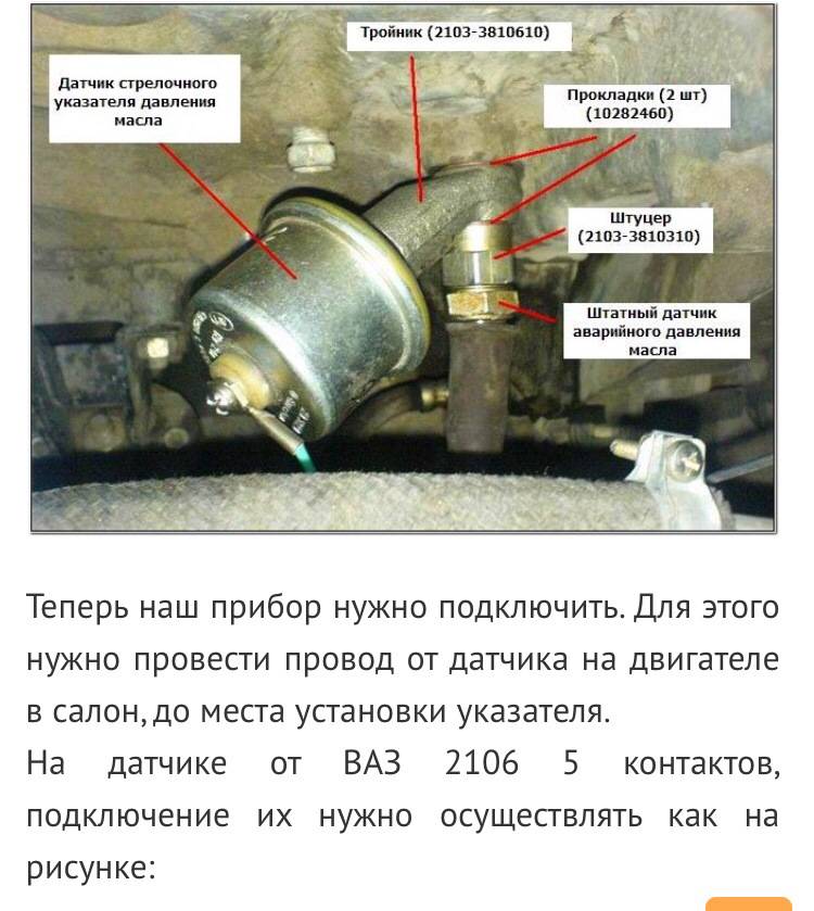 Подключение данного датчика осуществляется по следующей инструкции, как показано на фото ниже. Важно понимать, что подключать кабель к аварийному датчику давления масла не обязательно, так как штатный манометр находится на панели приборов.