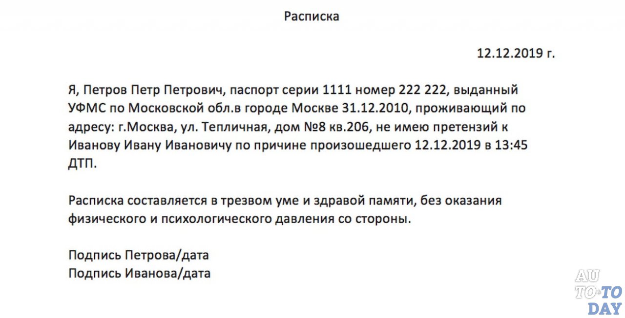 У каждой из сторон должен находиться свой образец документа, заверенный каждым из участников ДТП. Так как общего строгого образца расписки нет, поэтому главное, что должно в ней быть, это личные реквизиты участников происшествия и вышеперечисленные рекомендации.