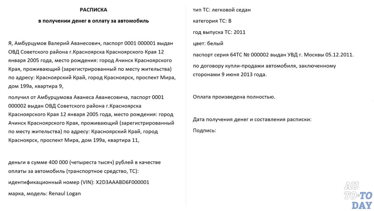 В законодательстве России о необходимости составления расписки в получении денежных средств за автомобиль ничего не сказано. То есть, теоретически, при продаже/покупке транспортного средства можно обойтись стандартным договором купли-продажи. Но на практике, особенно если в процедуре участвуют малознакомые люди, без расписки не обойтись.