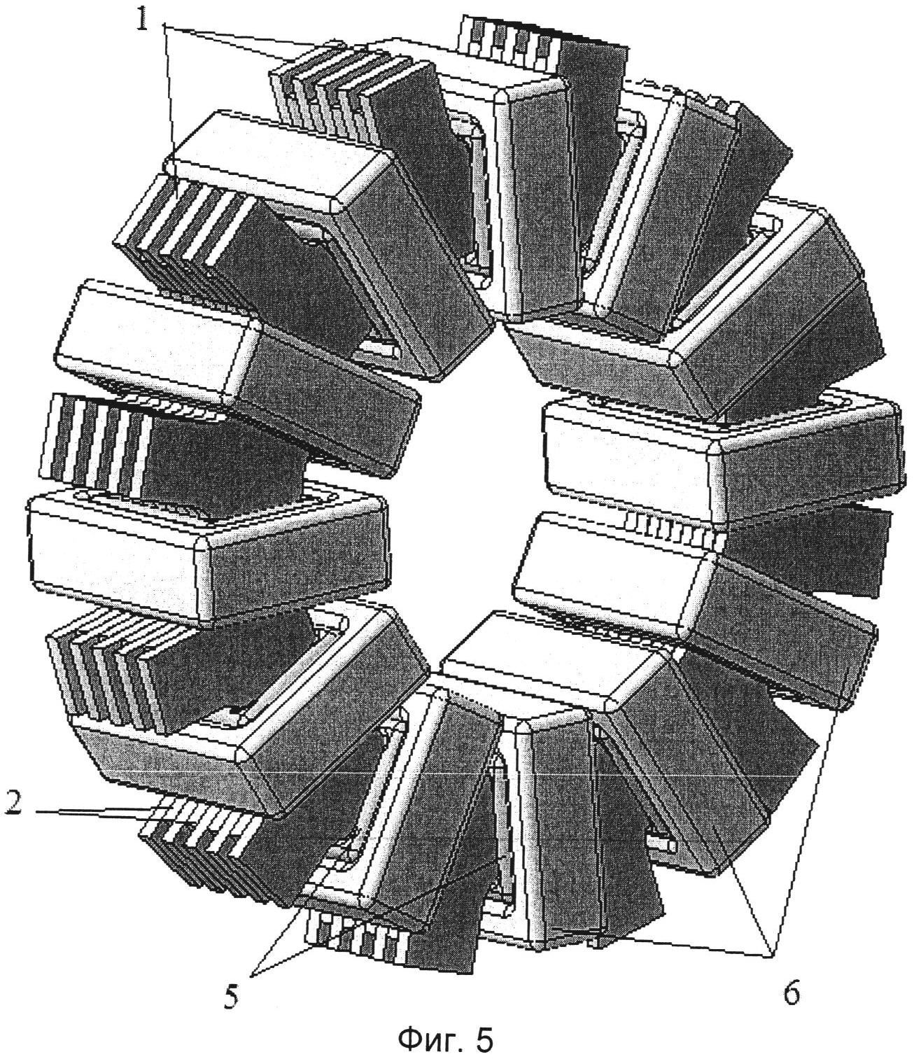 Слой высоковольтной обмотки 3, наиболее удаленный от магнитопровода 1, расщеплен на две секции 4 и 5, соединенные параллельно и имеющие равное число витков.