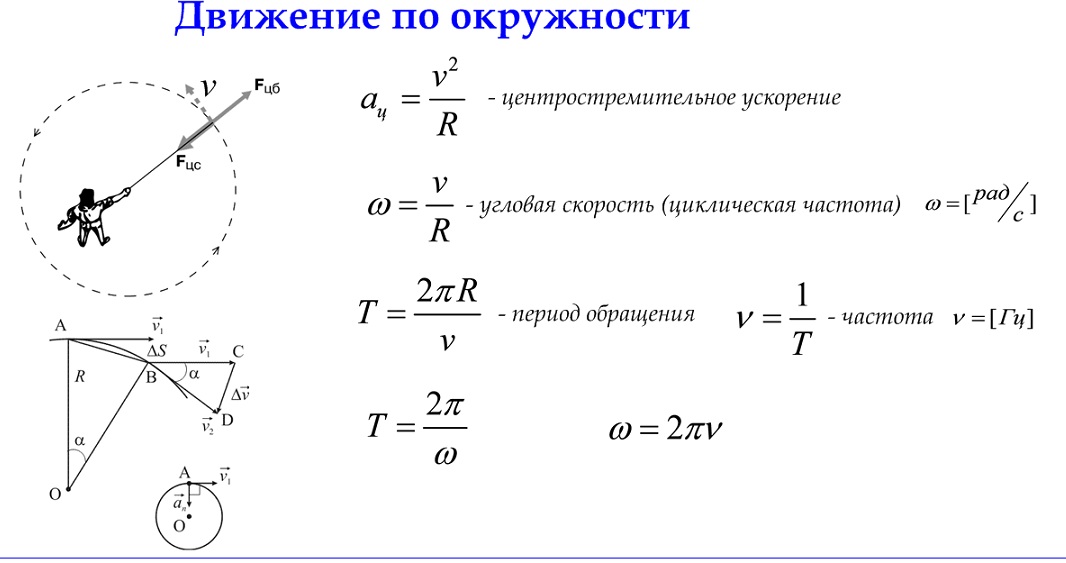 Скорость — это вектор, указывающий, насколько быстро (или медленно) преодолевается расстояние и направление движения. Так как вектор скорости (направление) тела изменяется при движении по окружности — возникает ускорение.