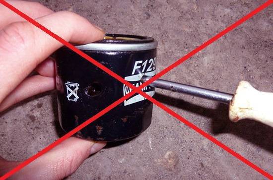 Для его реализации вам потребуется длинная отвертка. Проткните ею масляный фильтр насквозь, а затем сорвите его сильными плавными (не резкими!) движениями и просто выкрутите руками.
