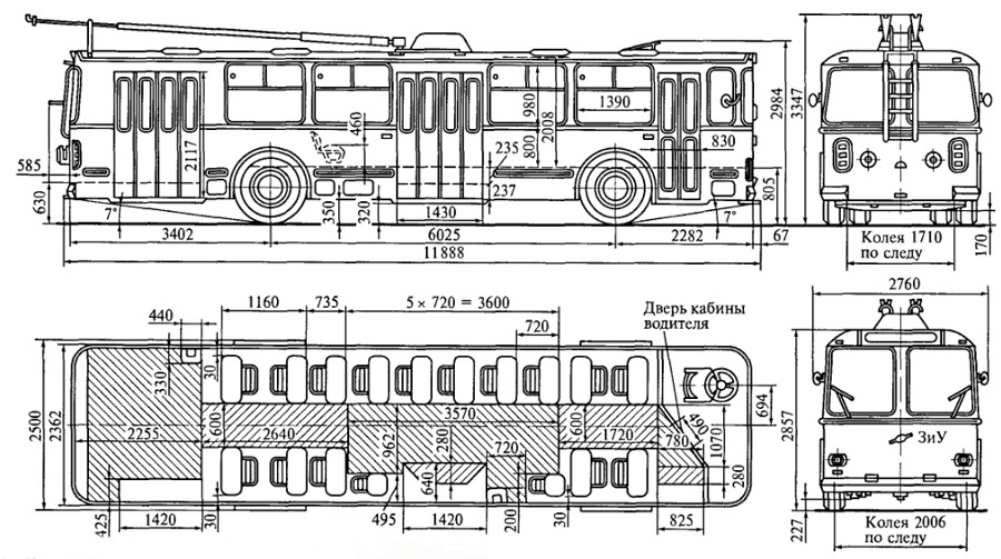 Планировка пассажирского салона предусматривала широкий проход и просторные накопительные площадки около дверей. Задняя площадка в прицепе была понижена по сравнению с центральным проходом на 120 мм, причём переход с площадки в салон выполнен в виде порога. Сиденья устанавливались по обеим сторонам салона и располагались на подиумах. Одно полуторное для пассажиров с детьми располагалось за передней дверью на колёсной арке. Это был ещё один признак того, что за основу был выбран немецкий троллейбус.