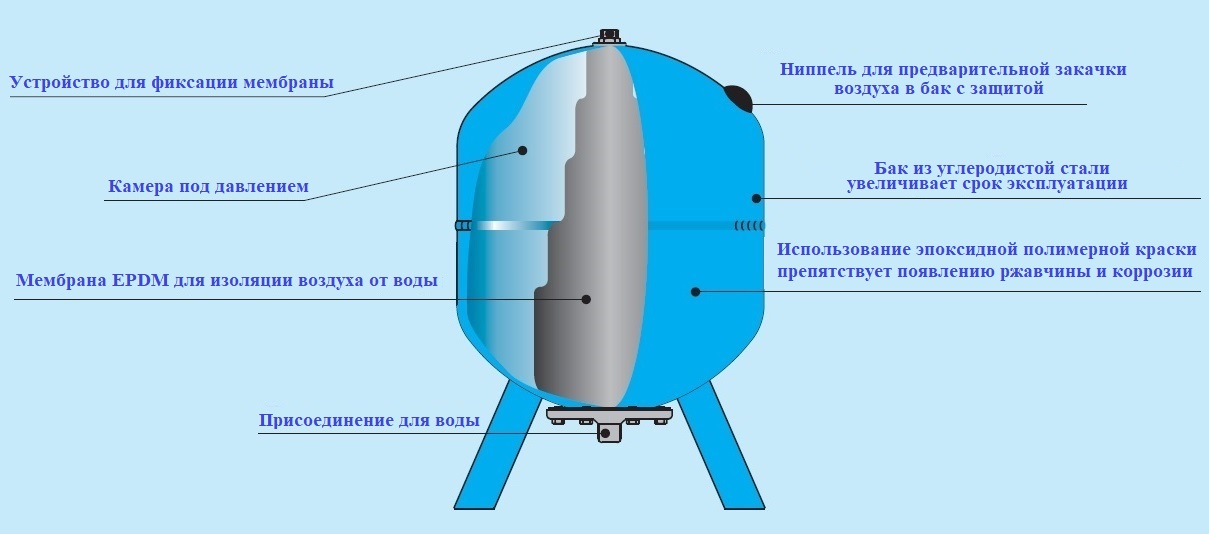 Стальные резервуары объединяют воду и воздух внутри себя для поддержания давления. Со временем вода может поглощать небольшое количество воздуха. При этом давление в баке падает.