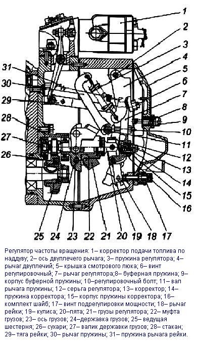 Регулятор частоты вращения рассматриваемого ТНВД включает в себя механический регулятор с центробежными грузами и систему управляющих рычагов.