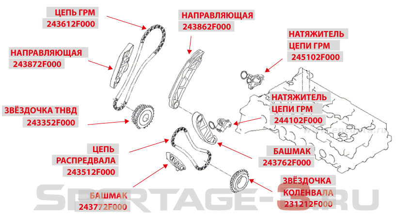 К счастью цепь на бензиновых 2-х литровых моторах G4KD ходит достаточно долго, в среднем ресурс цепи на наших Спортажах — 200 000 км. Сама по себе конструкция цепи очень мощная, состоящая из 4-х рядов, что позволяет ей долго служить.