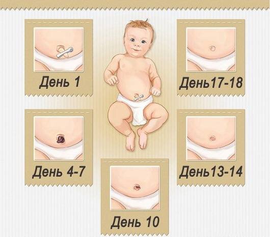 Изначально культя пуповины имеет желтоватый цвет и влажную консистенцию. Постепенно она высыхает, меняя окраску на фиолетовую, затем коричневую и черную. В норме пуповинный остаток отпадает в период от 5 до 15 дней после рождения.